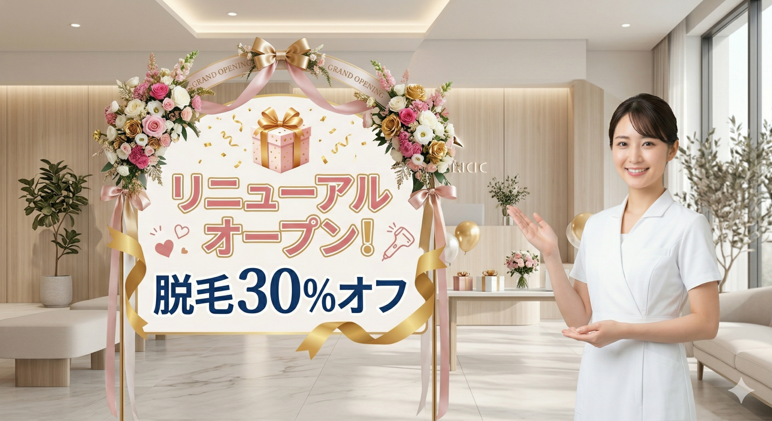 リニューアルオープンを記念して、医療脱毛を30%オフにて提供いたします。(全部位対象)